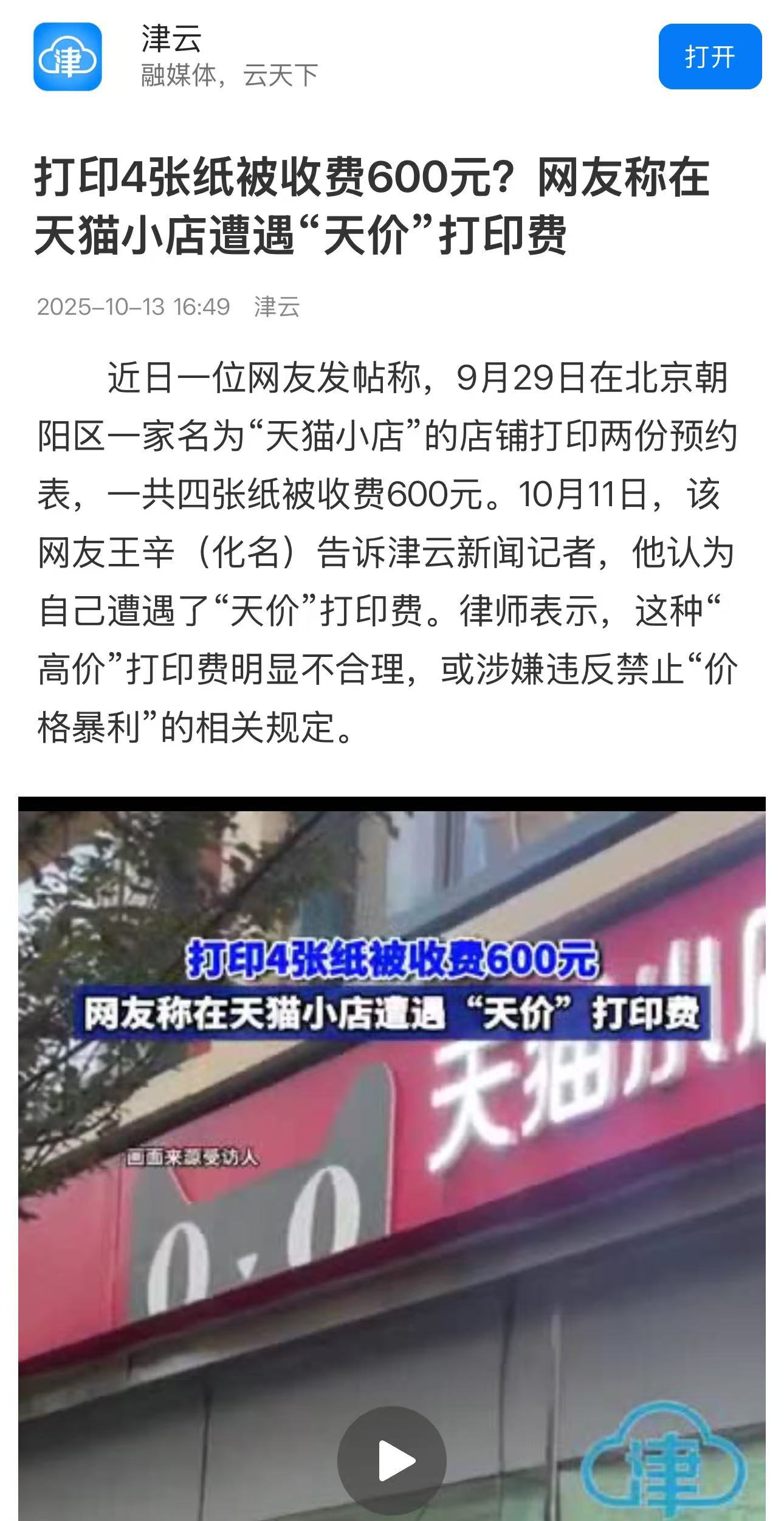 近日一位网友发帖称,9月29日在北京朝阳区一家名为“天猫小店”的店铺打印两份预约表,一共四张纸被收费600元。10月11日,该网友王辛(化名)告诉津云新闻记者,他认为自己遭遇了“天价”打印费。律师表示,这种“高价”打印费明显不合理,或涉嫌违反禁止“价格暴利”的相关规定。