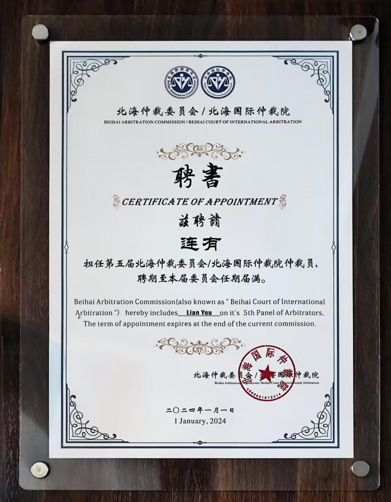 2021年5月19日连有主任被聘为北海国际仲裁院(北海仲裁委员会)仲裁员,2024年1月1日,连有主任再次被聘为北海国际仲裁院(北海仲裁委员会)仲裁员。