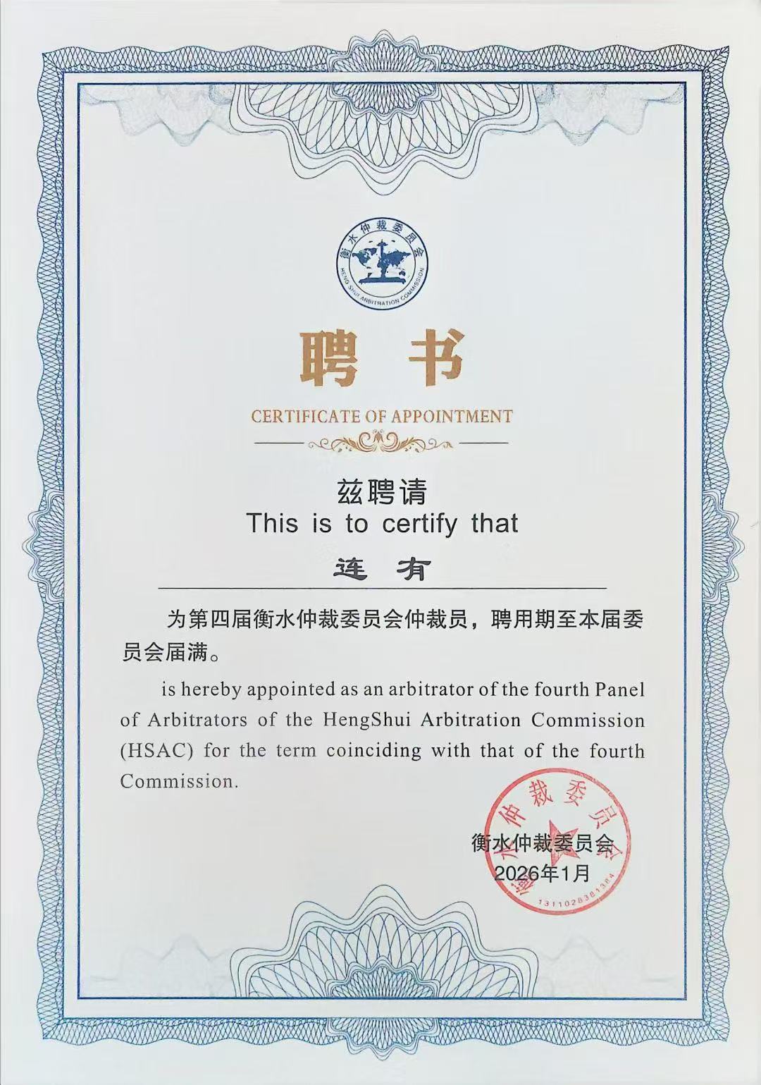 2025年9月1日衡水仲裁委员会在其官方发布了《第四届衡水仲裁委员会仲裁员 公开选聘公告》,经过公开选聘。衡水仲裁委员会于2026年2月26日发布了《关于发布第四届衡水仲裁委员会 仲裁员名册的公告》。《公告内容》如下:按照《中华人民共和国仲裁法》《衡水仲裁委员会仲裁员管理办法》的规定,经第四届衡水仲裁委员第一次会议审议通过,决定向170名专业人士授予仲裁员资格。其中,京津冀地区仲裁员73人,其他省份仲裁员15人,衡水市域仲裁员82人。《第四届衡水仲裁委员会仲裁员名册》于2026年1月26日起启用。特此公告。