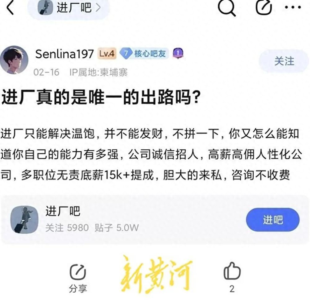 在百度贴吧“进厂吧”中,吧内多发布一些工厂招聘求职、上班日常交流等信息,有部分账号则通过发布一些高薪工作信息来吸引关注。记者注意到,用户名为“Senlina197”的一名发帖人发帖称“公司诚信招人,高薪高佣人性化公司,多职位无责底薪15k+提成,胆大的来私(信)。”记者发现,该账号同时还在“招聘吧”“招生代理吧”等多个贴吧发布类似招聘信息。
